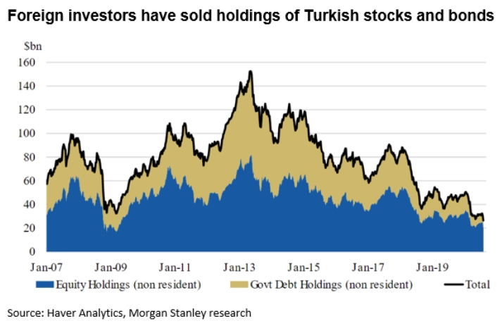 Одно большое отличие от 2018 и 2019 годов заключается в том, что сейчас на турецких рынках гораздо меньше международных инвесторов, которые могли бы уйти с местного рынка и тем самым спровоцировать дальнейшее снижение курса лиры.