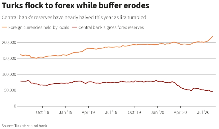 Валовые валютные резервы Турции упали ниже 47 миллиардов долларов по сравнению с 81 миллиардом в начале года. Министр финансов Берат Албайрак сказал, что валютные резервы остаются более чем адекватными, но его комментарии не смогли успокоить нервных инвесторов.