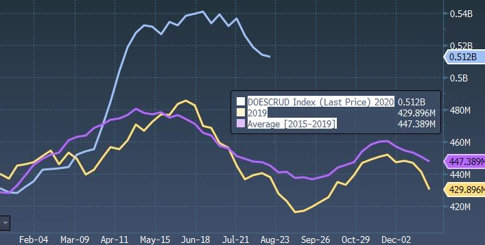 График запасов нефти в США: за последние 5 лет (фиолетовая линия), в 2019 году (желтая линия) и в 2020 году