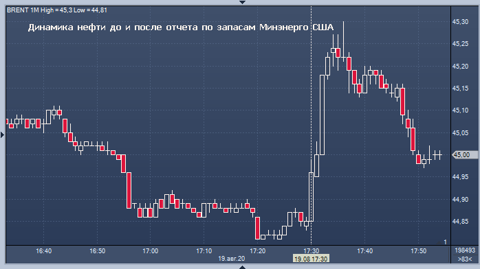 Цены на нефть пока никак не отреагировали на данные по сырья в США. незначительно снизились, Цены на нефть выросли в пределах 45 центов до отметки $45,30 по марке Brent после выхода официального отчета Управления энергетической информации (EIA) Минэнерго США о запасах нефти и нефтепродуктов в стране. Цифры отчета оказались смешанными: по сырой нефти — медвежьими относительно прогнозов и цифр института, по бензину — бычьими. По данным Американского института нефти (API), запасы нефти сократились на 4,3 миллиона баррелей до 512 миллионов за неделю, завершившуюся 14 августа, тогда как аналитики предполагали, что они снизятся на 2,7 миллиона баррелей.