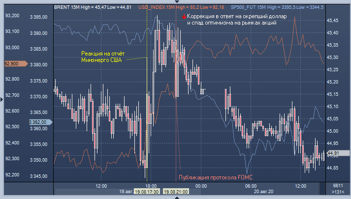 «Чёрное золото» дешевеет в ходе торгов в четверг на фоне общей подавленной атмосферы на финансовых рынках, воцарившейся после публикации протокола заседания FOMC. Укрепление и рост беспокойства относительно процесса восстановления экономики США доллара вынудили быков сдать позиции, занятые после неплохого отчёта по запасам, и вернуться к уровням ниже $45 за баррель. Октябрьский фьючерс на нефть марки брент сегодня теряет в цене более 1% и в настоящее время держится неподалёку от минимумов сессии в районе $44.83.