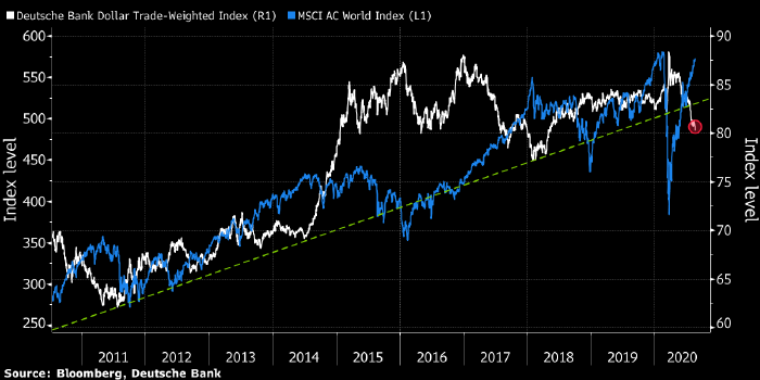 Приведенный выше график отражает довольно высокую корреляцию между динамикой широкого индекса акций MSCI World (голубым) и индексом доллара, взвешенного по объему внешней торговли, который рассчитывает Deutsche Bank (белым).