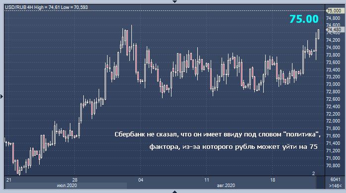 Аналитики Sberbank Investment Research, аналитического подразделения Sberbank CIB пояснили почему инвесторы продают рубль: из-за политики, общего ухудшения настроений на мировых рынках и укрепления доллара на рынке Forex, к чему сегодня добавится «традиционная осторожность инвесторов в преддверии выходных». По оценкам аналитиков Сбербанка, если геополитический фон будет стабилен, российская валюта может частично отыграть потери, а в случае обострения ситуации рубль может пробить отметку 74 за доллар и даже подешеветь до 75.