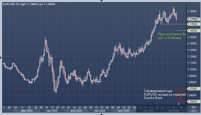 Прогноз Danske Bank по EURUSD на 1 и 3 месяца составляет 1.16, при этом в банке отмечают, что справедливый курс пары исходя из соотношения цен активов составляет 1.07, а исходя из показателей продуктивности и торговли – 1.05. Прогнозы банка на 6 и 12 месяцев пока остаются на уровне 1.12.