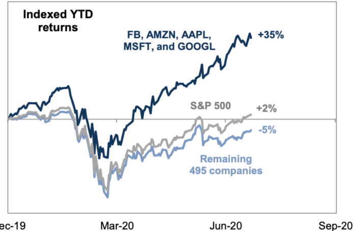 Индекс пяти технологических супергигантов (Facebook, Amazon, Apple, Microsoft и Google) вырос с начала года на 35%, а вот динамика S&P 500 без этих бумаг выглядит совсем не так впечатляюще, пишет Goldman Sachs. Индекс широкого рынка прибавляет в этом году 2%, тогда как индекс остальных входящих в него 500 бумаг теряет 5% (см. график в начале статьи). Напомним, в индексе широкого рынка S&P 500 сейчас 505 компаний-компонентов.