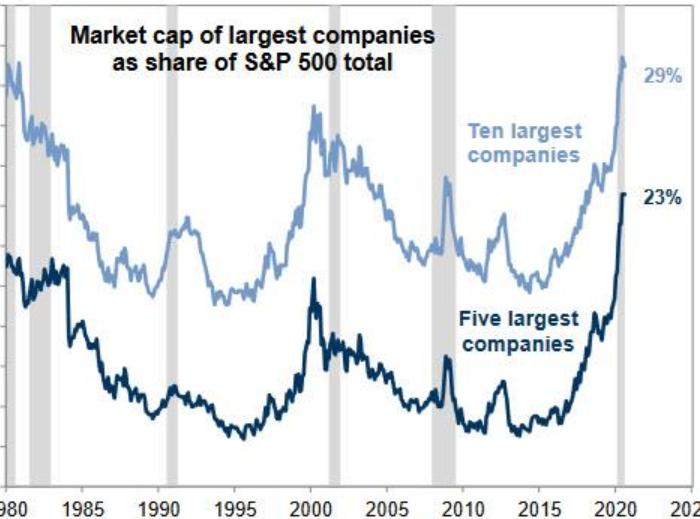 Подобное развитие событий легко объяснимо: на долю пяти крупнейших компаний из S&P 500 приходится 23% всей капитализации индекса, а на долю десяти крупнейших компаний — 29% (см. график ниже).