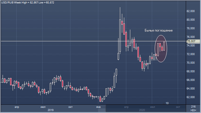 У поклонников технического анализа рынка бытует утверждение, что цена учитывает все. С этой точки зрения перспективы рубля выглядят не очень радужно. Дело в том, что рубль заметно ослаб к доллару на последней неделе июля, затем 2 недели августа восстанавливал потери. Однако текущая неделя сформировала «бычье поглощение» в валютной паре USDRUB. С точки зрения технического анализа это означает, что двухнедельная коррекция завершена и теперь должна продолжаться восходящая тенденция, которая наблюдается с июня. Если теперь курс должен продвинуться вверх на половину предыдущего движения, то это подразумевает в ближайшие 2 недели 78 рублей за доллар. По крайней мере об этом говорит технический анализ.