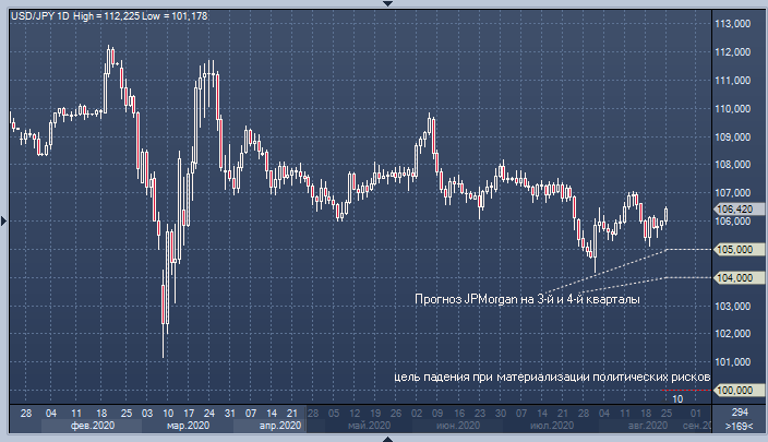 В JPMorgan придерживаются базового прогноза по USDJPY на третий квартал на уровне 105 иен за доллар США и на уровне 104 на четвертый квартал, однако допускают возможность обвала пары до 100 при определенных условиях.