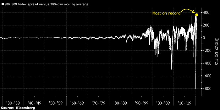 Рекордный по скорости и масштабам рост рынка акций США, который наблюдался в последние месяцы, вывел фондовый индекс S&P 500 на невиданную орбиту. Он не только показал рекордное ралли в абсолютном выражении, т. е. в индексных пунктах, но и поднялся над своей 200-дневной скользящей средней на беспрецедентное с января 2018 года количество процентов.