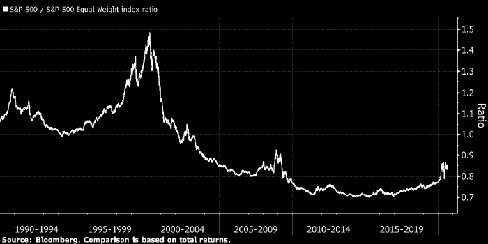 За последние 20 лет отношение S&P 500 к этому же индексу, но рассчитанному, исходя из равного веса всех входящих в него акций, снизилось на 50% с лишним (с учетом дивидендов, см. график ниже). В этом году пятерка технологических суперкомпаний смогла отыграть меньше одной четвертой этого снижения.