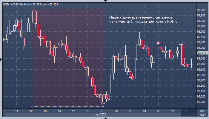 Индекс доллара DXY остается в области многомесячных минимумов накануне выступления главы ФРС Джерома Пауэлла в Джексон-Хоул, и слабость американской валюты должна насторожить инвесторов на рынке акций, пишет Bloomberg. Схожая ситуация наблюдалась неделю назад, когда курс доллара уверенно снижался в преддверии публикации протокола последнего заседания FOMC, которое состоялось 28-29 июля.