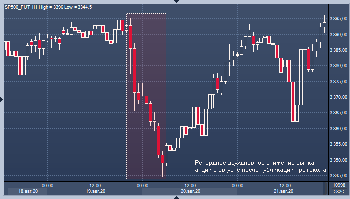 Тогда инвесторы ждали, что регулятор обозначит свое намерение приступить к контролю кривой доходности трежерис, однако указаний на это в тексте документа не увидели. Разочарование, помноженное на большую короткую позицию, спровоцировало заметный рост курса доллара и наиболее масштабное в этом месяце двухдневное снижение рынка акций США.