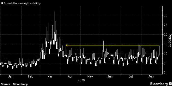 Индекс волатильности евро/доллара поднялся до трехнедельных максимумов и может закрыть месяц на рекордных с весны уровнях (см. график в начале статьи). Это говорит о нервозности трейдеров, отмечает Bloomberg.