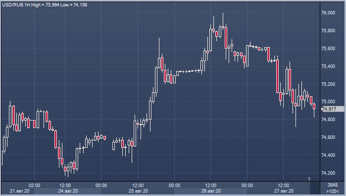 Рубль по отношению к доллару продолжил восстанавливать ранние потери вечером в четверг и ближе к закрытию торгового дня опустился ниже психологического уровня 75,00.