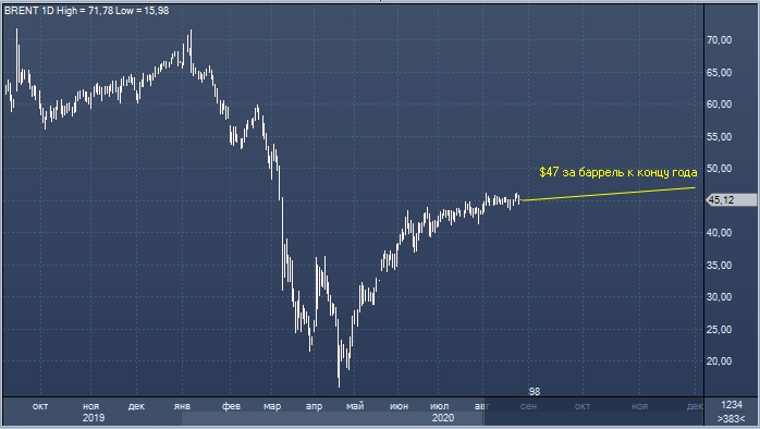 Цена нефти Brent вырастет до 47 за баррель в 4 квартале 2020 г., затем поднимется до 53 за баррель в 2021 году и до 65 за баррель в 2022 году.
