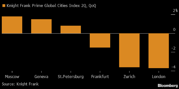 Резкое снижение ставок по ипотеке привело к усилению спроса на жилье, отмечает строительная компания «ПИК». Цены на жилье в Москве за последние три месяца выросли на 10% (Москва стала лидером по росту цен на элитную недвижимость в Европе во втором квартале, см. график ниже — прим. ProFinance.ru), пишет Bloomberg со ссылкой на данные совладельца застройщика «МИЦ» Андрея Рябинского.