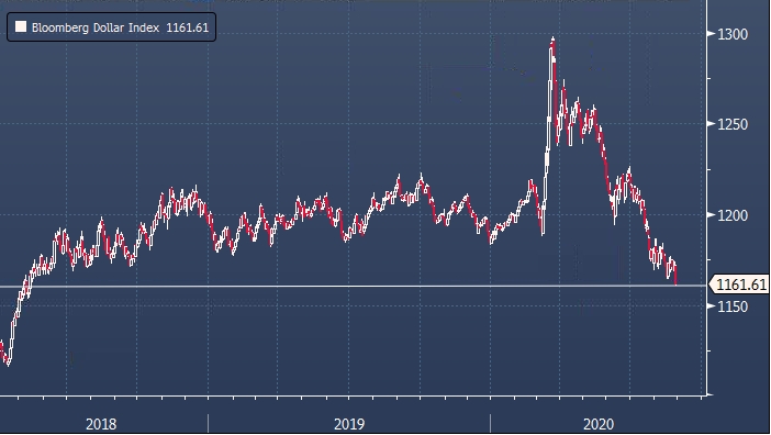 На фоне спроса на риск и снижения спроса на активы безопасной зоны индекс доллара, рассчитываемый Bloomberg, опустился до минимума с мая 2018 года.