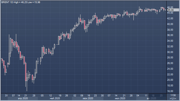 Ноябрьские фьючерсы на нефть марки Brent выросли на 0,6% до 45,86 доллара за баррель в пятницу. Американская нефть WTI подешевела на 0,26% до 42,93 доллара за баррель. Американский бенчмарк растет уже 4-ю неделю подряд. За текущую неделю котировки выросли на 1,4%. Brent за 5 торговых дней подорожал на 2%.