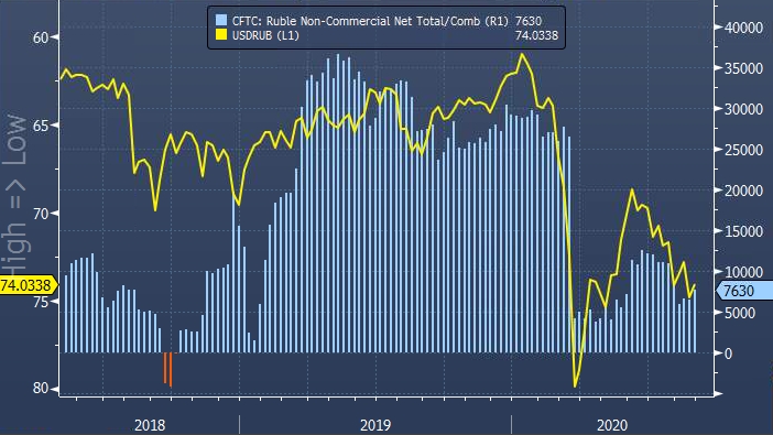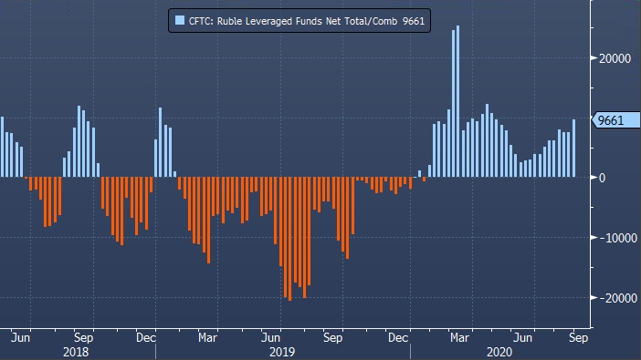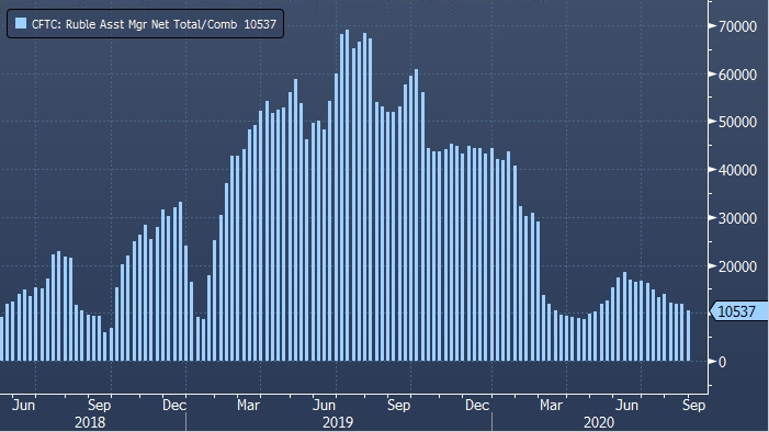 Если оценить статистику CFTC по рублю более подробно, то можно отметить, что сальдированная длинная позиция тех участников рынка, которые торгуют с кредитным плечом (leveraged funds), увеличилась на 28.1% (2 118) до 9 661 контрактов на отчетной неделе. Это максимальный проирост с недели, которая завершилась 14 июля.