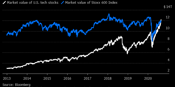 Безостановочный рост рынка акций США, локомотивом которого выступают бумаги технологических компаний, создал уникальный феномен. Теперь капитализация компаний технологического сектора США* впервые в истории превышает капитализацию европейского фондового индекса Stoxx 600 (см. график выше — прим. ProFinance.ru).