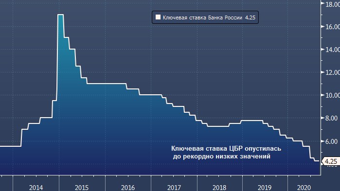 Банк России может опустить ключевую ставку ниже 4% уже в этом или следующем году, полагает главный экономист Bank of America по России Владимир Осаковский. Эксперт указывает, что планируемая консолидация бюджета может ограничить потенциал восстановления российской экономики в 2021-2022 годах, однако оно же создаст предпосылки для дальнейшего смягчения денежно-кредитной политики ЦБР.