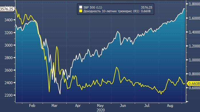 Рынок акций США, представленный фондовым индексом S&P 500, закрывается на исторических максимумах уже девять торговых сессий подряд, что является значимым событием в преддверии публикации данных по рынку труда страны, пишут стратеги BMO Capital Markets. Они отмечают, что доходность трежерис при этом не растет, а попытки облигационной кривой стать более выпуклой ни к чему не приводят. Это говорит о сомнениях инвесторов в быстром восстановлении экономики США.
