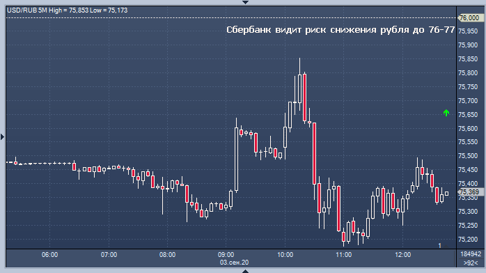 В четверг утром курс рубля вышел на новые минимумы, после чего резко скорректировался вверх (см. график). По словам аналитиков Сбербанка, укрепление доллара на рынке Forex может продолжиться в четверг, и если это будет сопровождаться усилением геополитической напряженности, рубль может протестировать уровни 76,0-77,0 за доллар.