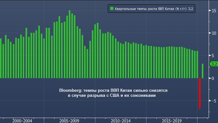 Однако Китай может столкнуться с еще более серьезными негативными последствиями, если США сумеют уговорить своих ключевых союзников, таких как Япония, Южная Корея, Германия и Франция, также разорвать отношения с Пекином. При таком сценарии темпы роста ВВП Китая замедлятся к 2030 году до 1.6%, прогнозирует BE.
