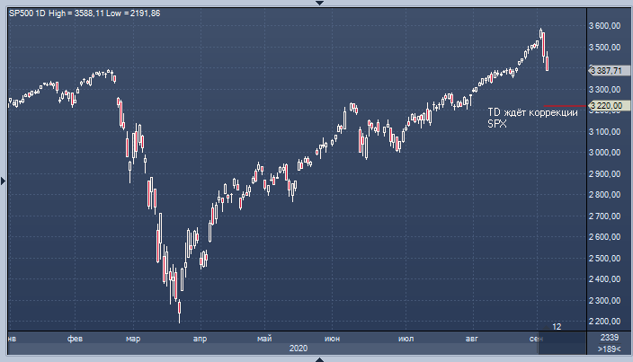В TD Bank считают, что SPX оказался переоценен где-то на 10%, а сентябрь исторически был не самым лучшим месяцем для быков, что предполагает потенциал для коррекции к 3220 пунктам, тогда как от VIX стоит ожидать уверенного возвращения к уровням в области выше 30 пунктов.