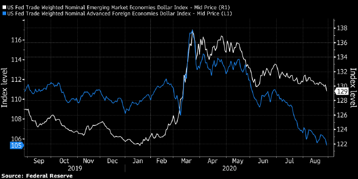 В конце марта курс доллара достиг многолетних максимумов против корзины валют развитых стран и рекордных значений против корзины валют развивающихся стран. С тех пор доллар дешевеет на фоне потока рекордной ликвидности со стороны ФРС, но при этом он подешевел против корзины валют DM на 10%, а против корзины валют EM – лишь на 6%*.