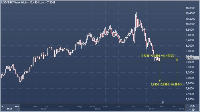 Шведская крона выросла на 7% к доллару с начала 2020 года и достигла на этой неделе 2-летнего максимума. Улучшение глобального аппетита к риску и соответствующая слабость доллара будут и в дальнейшем оказывать поддержку скандинавской валюте, считают стратеги Danske Bank. В то же время аналитики Credit Agricole подчеркивают, что признаки восстановления шведской экономики также поспособствуют росту своей национальной валюты.