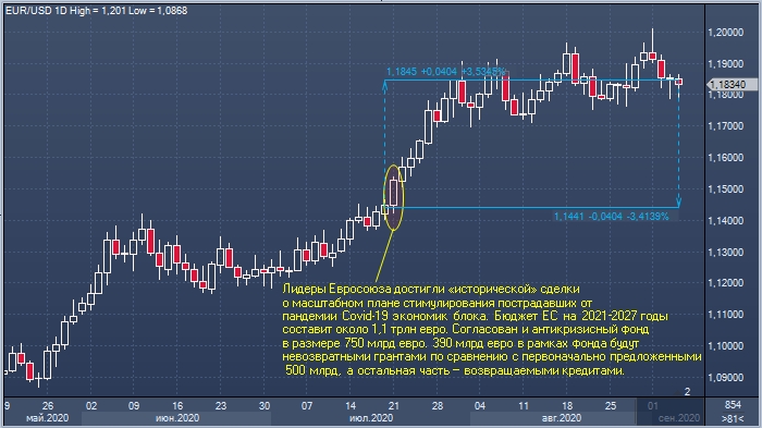 Евро стал основным бенефициаром слабого доллара. Стоит напомнить, что в июле Евросоюз одобрил пакет помощи в размере 750 млрд евро, и с того момент единая валюта подорожала к доллару на 3,5%. ЕЦБ уже предупредил, что дальнейшее укрепление валюты будет негативно влиять на экспорт, снизит ценовое давление и будет являться аргументом в пользу дополнительных стимулов.
