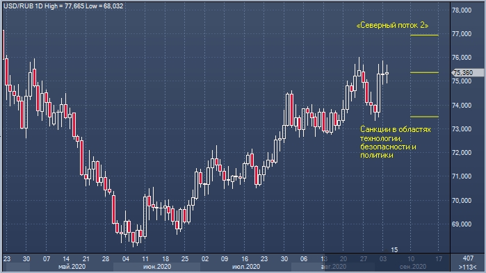 Курс рубля по отношению к доллару может ослабнуть до 77,00, если против РФ будут введены экономические санкции, такие как остановка строительства «Северного потока 2», предсказали накануне аналитики ITI Capital.