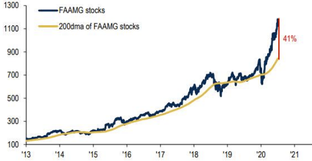 В результате этих событий индекс крупнейших технологических супергигантов FAAMG (Facebook, Apple, Amazon, Microsoft и Google) находился до недавнего обвала рынка акций на 41% выше своей 200-дневной МА (см. график ниже — прим. ProFinance.ru), что лишь немногим уступает аналогичному показателю марта 2000 года на уровне 55% (тогда состав индекса выглядел по-другому — прим. ProFinance.ru).