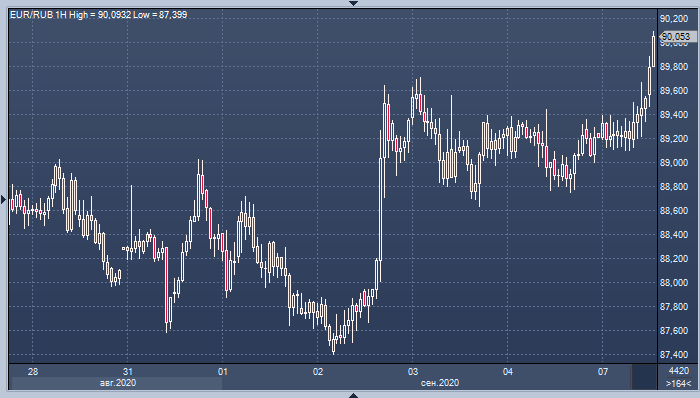 Курс евро к рублю на Московской бирже превысил 90 впервые с февраля 2016 года, а курс доллара к рублю поднялся выше 76 и достиг рекордных значений с этого апреля.