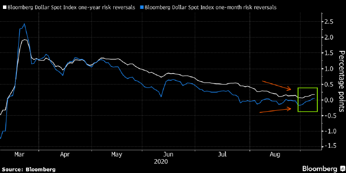 Сегодня опционная премия 1-месячных кол-опционов на BBDXY превышает аналогичную премию пут-опционов на 6 базисных пунктов, что является рекордным значением за последние шесть недель.