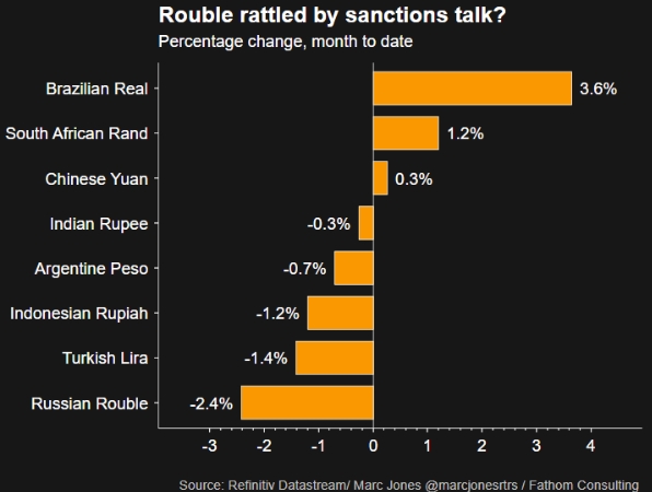 На развивающихся рынках турецкая лира достигла еще одного рекордного минимума, а российский рубль упал до самого низкого уровня с апреля на фоне продолжающихся разговоров о новых санкциях Запада.