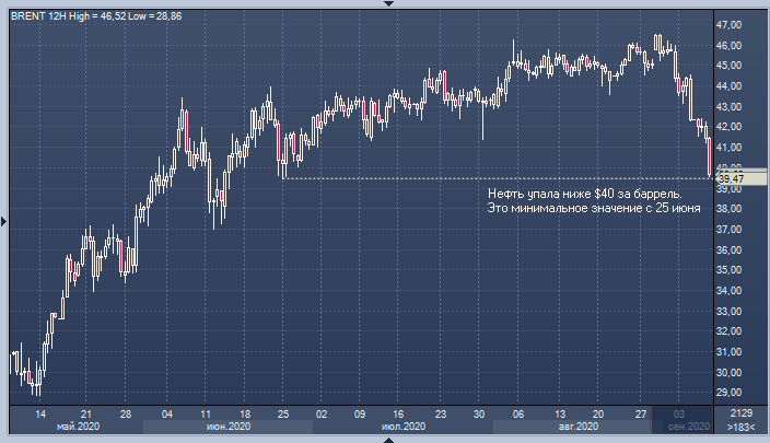 Цены на нефть продолжают стремительно падать: в ходе торгов во вторник ноябрьский фьючерс на брент достиг минимальной отметки с 25 июня и в настоящее время торгуется в районе $39.70, теряя в цене 5.5%. За последние пять торговых сессий «чёрное золото» подешевело уже более чем на 12%, и эксперты опасаются, что в сложившихся условиях цены могут вернуться на уровни около $35 за баррель.