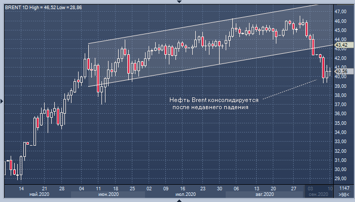 На этой иллюстрации приведен график цены нефти Brent с интервалом 1 день
