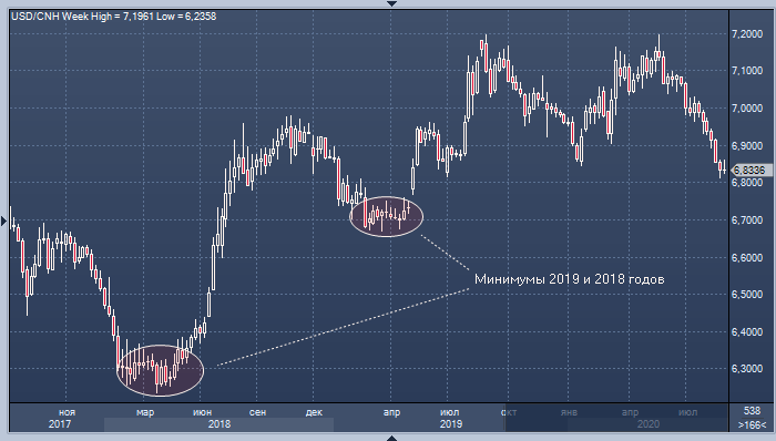 У Пекина есть несколько вариантов действий, которые можно предпринять, чтобы ограничить снижение курса доллара к юаню. Например, он может снизить ставки, облегчить кредитные условия и запустить дополнительное бюджетное стимулирование. Если пара пробьет минимум прошлого года около 6.6850, то сможет быстро пуститься в область минимумов 2018 года около 6.2350.