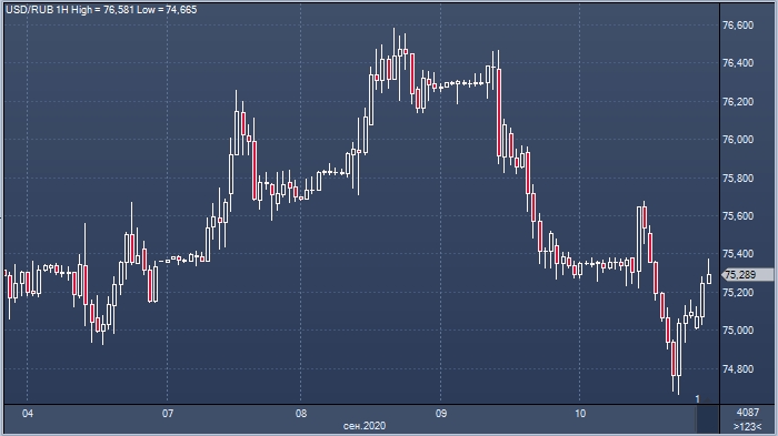 Курс рубля по отношению к доллару вернулся вечером в четверг к уровням закрытия предыдущего дня, растеряв все свои достижения, приобретенные в ходе дневной торговой сессии. На старте торгов в валютной секции Мосбиржи курс USDRUB утром подскочил до 75,70, но затем стабильно снижался и достиг к началу американской сессии 74,65 за единицу валюты США. Но затем USDRUB возобновил рост и поднялся до 75,40 к вечеру. При этом EURRUB весь день стабильно держался выше 88,80, а к вечеру пытается завершить торги выше 89,00.