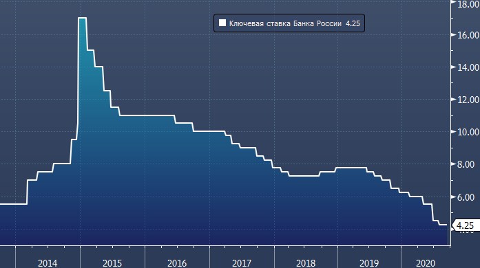 Средний прогноз экономистов, опрошенных агентством Bloomberg, предполагает, что в следующую пятницу Банк России сохранит ключевую ставку на уровне 4.25%, а к концу года опустит ее до 4%. Повышение ставки ожидается в четвертом квартале 2021 года.