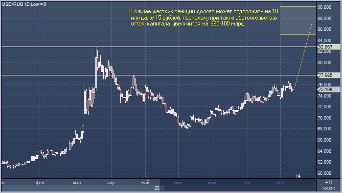 В случае жестких санкций доллар может подорожать на 10 или даже 15 рублей, поскольку при таких обстоятельствах отток капитала увеличится на $60–100 млрд, предупреждают эксперты. При таком сценарии произойдет заметный сдвиг вверх кривой ОФЗ, которые сейчас не содержат большую премию за геополитические риски.