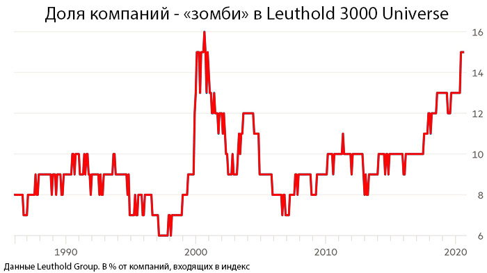Компаниями-зомби называют корпорации, чья прибыль в течение по крайней мере трёх последних лет была ниже, чем объем процентных платежей по долговым обязательствам. Доля таких компаний в индексе Leuthhold 3000 Universe, который является эквивалентом индекса Russel 3000, в конце прошлого года составляла 13% против 8% в конце 2008. К настоящему времени она достигла уже 15% — лишь на один процентный пункт меньше, чем в 2000 году, когда лопнул пузырь доткомов.