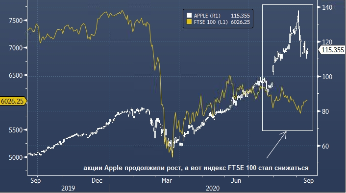 Ярким показателем того, насколько увлечены инвесторы горсткой быстрорастущих технологических компаний, является тот факт, что Apple Inc. стоит столько же, сколько весь индекс британского фондового рынка.
