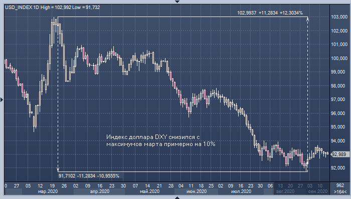 Индекс доллара DXY снизился с максимумов марта* примерно на 10%, и в процессе американская валюта подешевела против всех основных валют, а также против золота, серебра и платины.