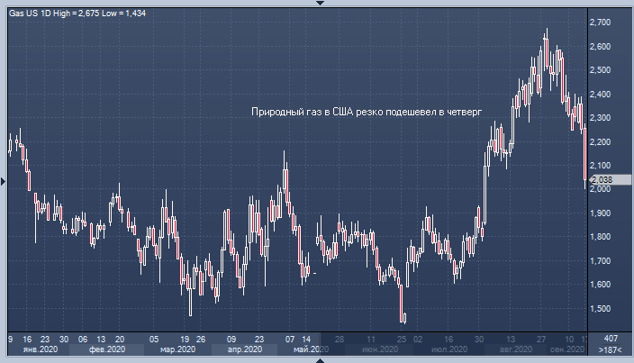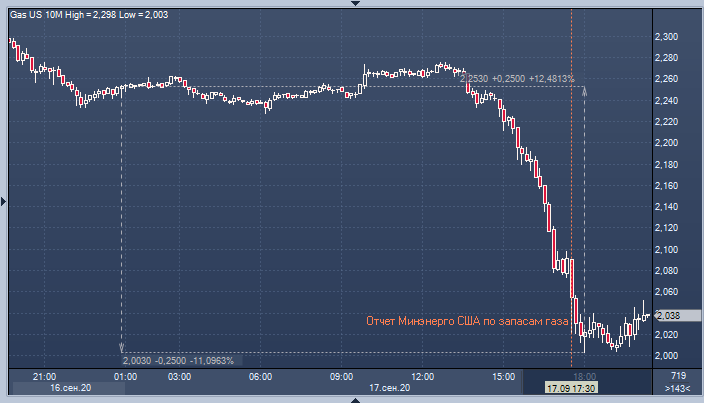 Природный газ в США обвалился в цене в ходе торгов в четверг: фьючерс на голубое топливо с поставкой в октябре сегодня проверил на прочность поддержку в районе $2.00 за миллион британских термальных единиц ($70.86 за тысячу кубометров), показав падение в пике более чем на 11% — максимальное с января 2019 года. В настоящее время он держится в районе $2.038 за MMBtu, теряя 9.6%.