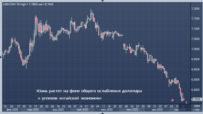 На графике периодом свечи в 1 день видим рост офшорного китайского юаня к доллару