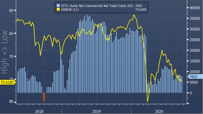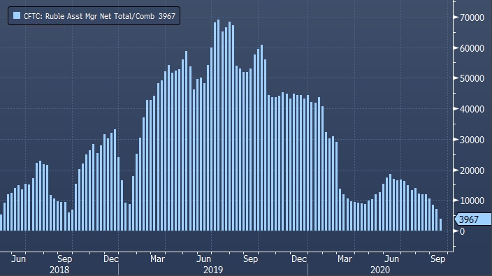 Спекулятивные ставки на рост курса рубля на Чикагской товарной бирже (CME) сократились на отчетной неделе на 7,6% после падения на 4,7% неделей ранее. Сальдированная длинная позиция во фьючерсах на рубль уменьшилась на 630 до 7 652 контрактов, свидетельствуют данные Комиссии по торговле товарными фьючерсами (CFTC). Статистика отражает положение дел по состоянию на 15 сентября. В конце августа ставки на рост курса рубля заметно увеличивались. Однако после политических событий в Белоруссии и ситуации с оппозиционером Алексеем Навальным спекулянты начали сокращать лонги по рублю. Курс рубля за неделю до 15 сентября вырос на 1,7%. Это был третий результат среди 24 валют развивающихся рынков, остлеживаемых Bloomberg. Лучше за указанный период оказались максиканское песо (+3,1%) и южноафриканский ранд (+3%).