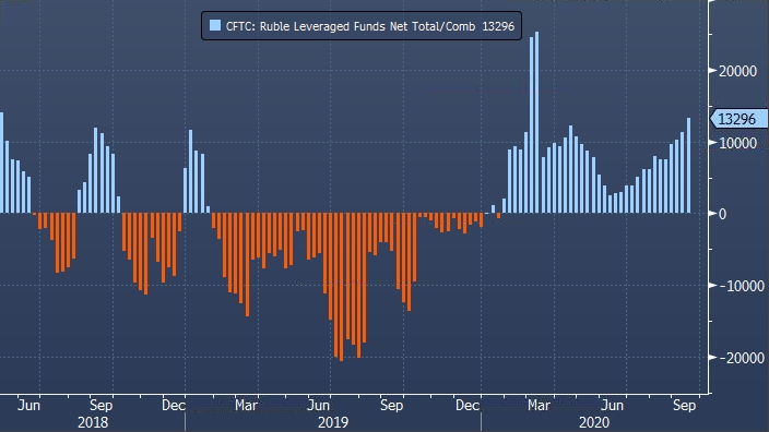 Если оценить статистику CFTC по рублю более подробно, то можно отметить, что сальдированная длинная позиция тех участников рынка, которые торгуют с кредитным плечом (leveraged funds), увеличилась на 16.9% (1 919) до 13 296 контрактов на отчетной неделе. Эта категория участников рынка 5 недель подряд увеличивает сальдированный лонг по рублю.